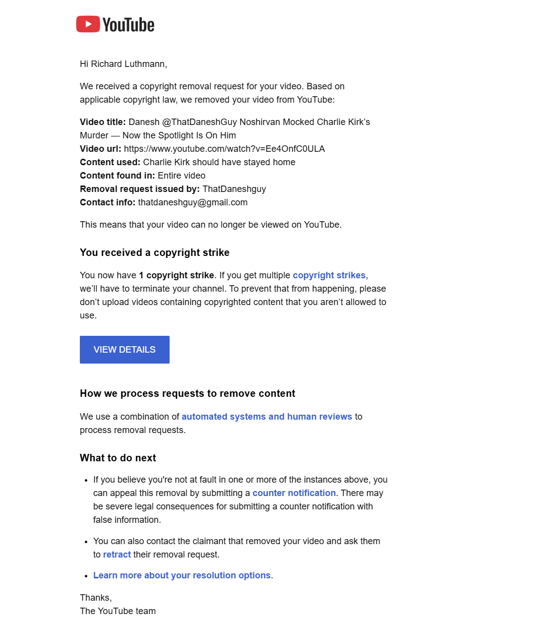 Danesh’s takedown email from “ThatDaneshGuy” using a Gmail address identified the claimed content — “Charlie Kirk should have stayed home” — was to be scrubbed from the Internet. Danesh had already pulled the same video from YouTube, TikTok, Instagram, and other social media platforms.