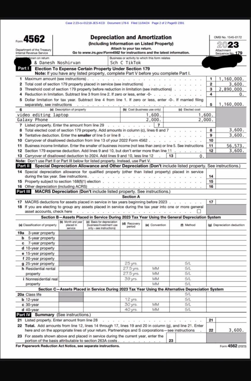 Danesh’s 2023 IRS Form 4562 – filed into the case – lists TikTok as his business. It shows that he placed $1,160,000 in property into service, with a threshold cost of $2,890,000. Remarkably, the form reports a business income limitation of $56,573 and a Section 179 deduction of $3,600.