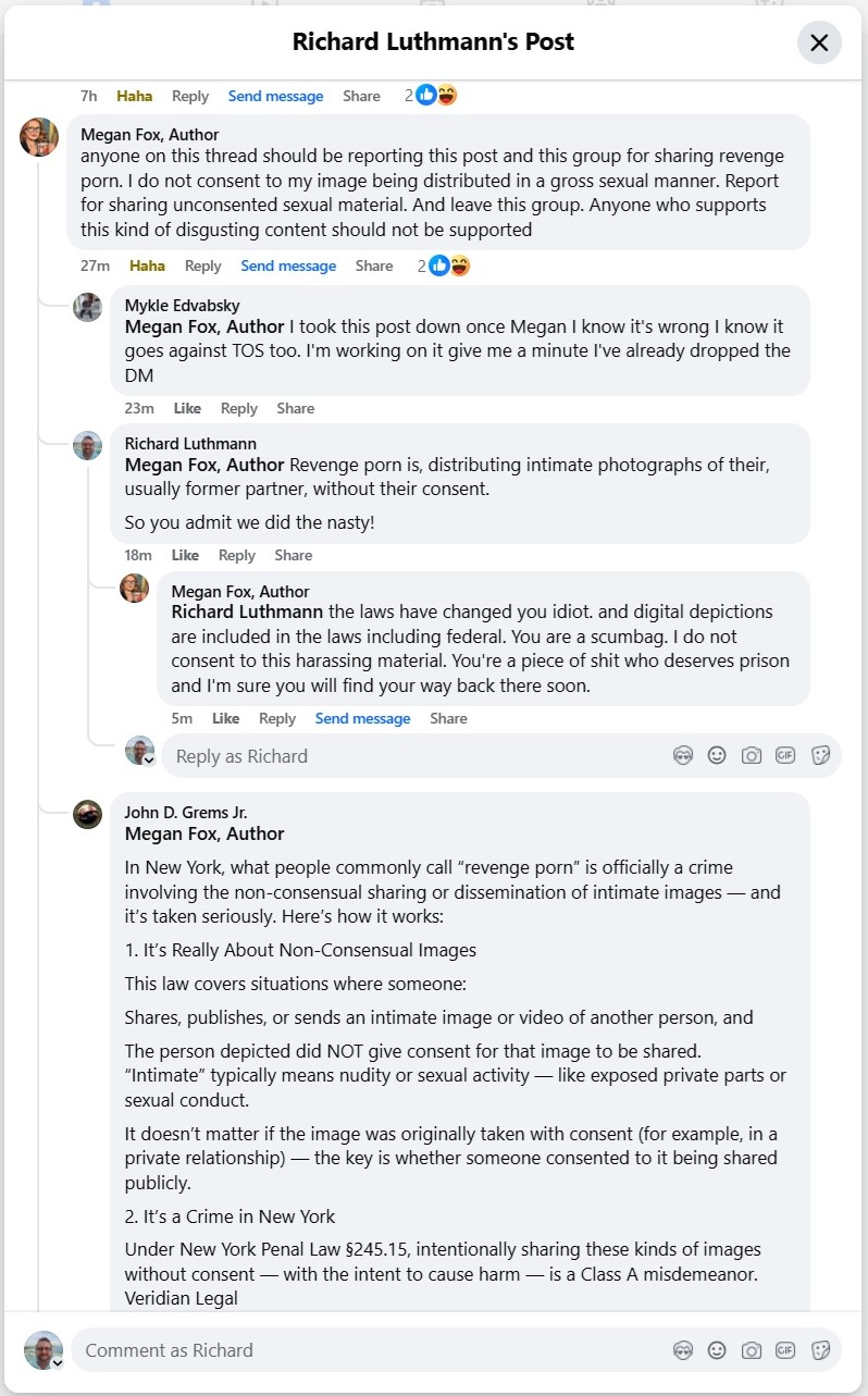 Fox took to Facebook in a fury, urging her own fans to report Luthmann’s post “for sharing revenge porn,” screeching that she “did not consent to [her] image being distributed in a gross sexual manner” and ordering followers to “leave this group” if they support “this kind of disgusting content.”