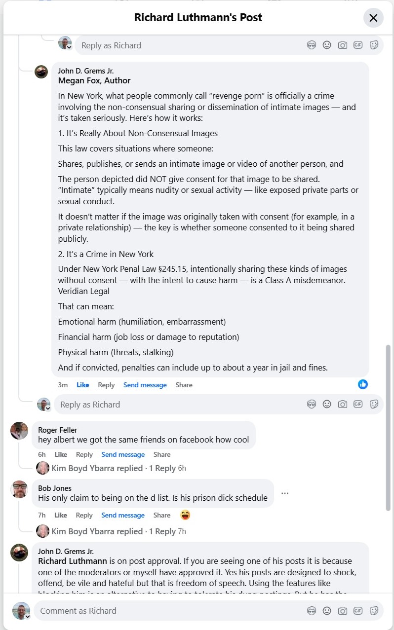 In the Facebook fracas, one moderator begrudgingly defended Luthmann’s right to speak, noting that yes, his posts are “designed to shock, offend, be vile and hateful,” but “that is freedom of speech… he has the right to share his opinion.”