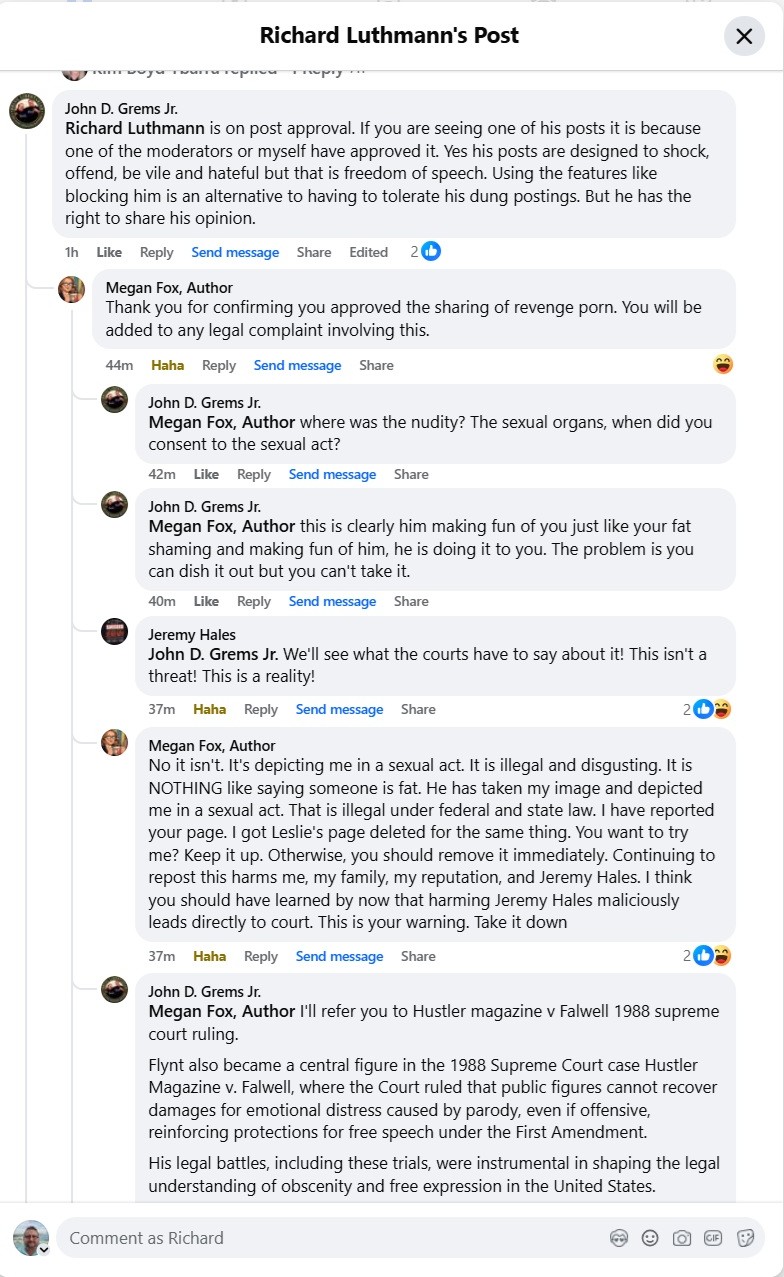 Fox, for her part, explicitly warned that anyone who posts content that “harms” her or poor Jeremy’s reputation will be dragged to court – boasting that she even got another critic’s page deleted as punishment. The irony is thicker than Hales’s skull: Fox openly harassed Luthmann by fat-shaming him, but cries foul that she was depicted (fully clothed, cartoon-style) in a sexual gag.