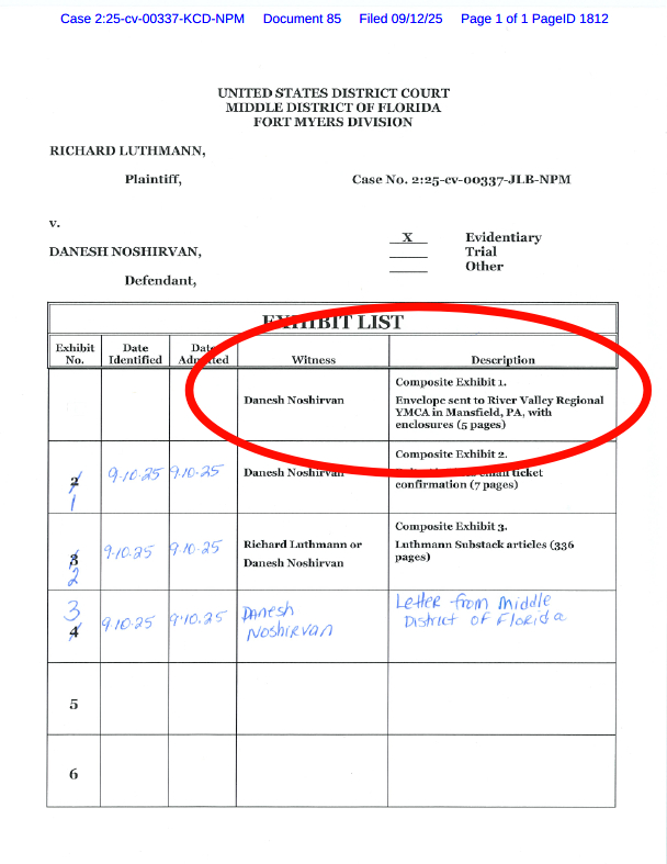 Noshirvan has made several highly questionable moves. Aside from the deposition blow-up that cost him $62K, Danesh and his lawyer, Nick “Nickless” Chiappetta, apparently offered fraudulent evidence to the Fort Myers federal court during a September hearing. In keeping with his victim modus operandi, Danesh claimed that Luthmann sent a letter to the Mansfield YMCA to defame his wife, Hannah.