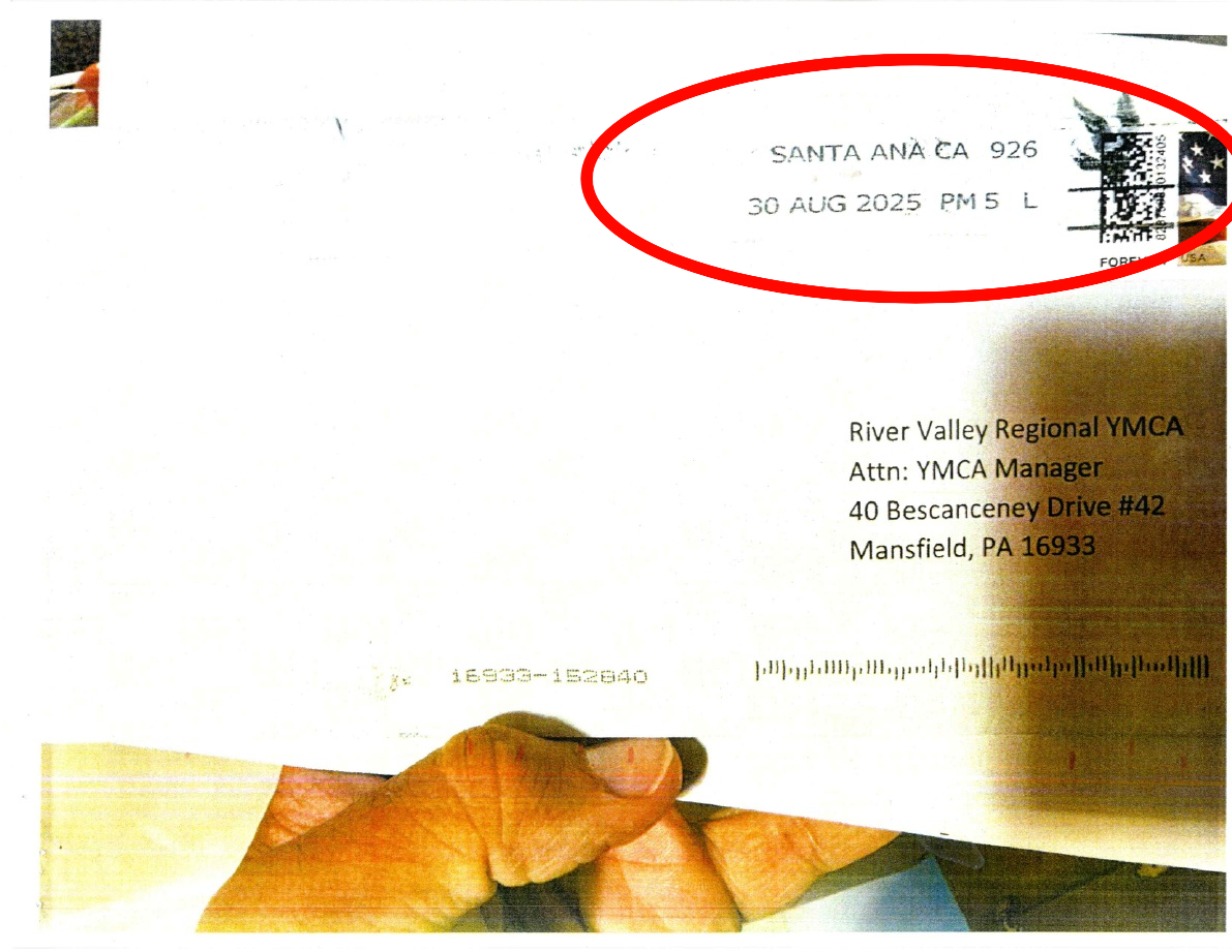 While Luthmann denies the letter, the US Postal Service stamp on the envelope only implicates Danesh. The letter was sent from SANTA ANA, CALIFORNIA, in August 2025.