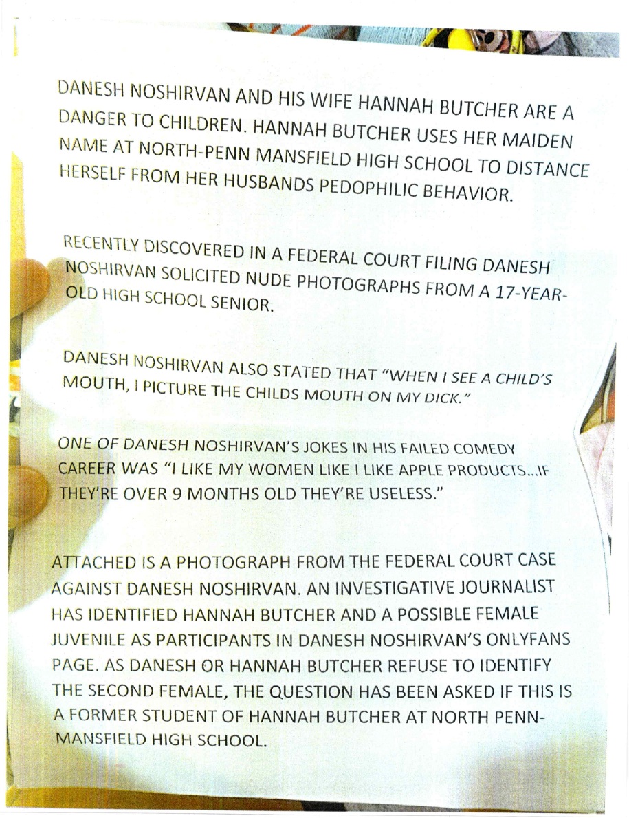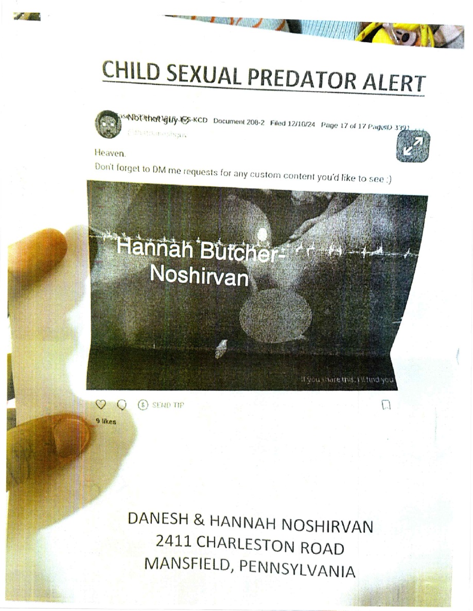 Noshirvan now claims, without corroboration, that flyers appeared in his neighborhood, that grotesque packages were mailed, that his wife’s workplace was attacked, and that Camp somehow encouraged self-harm—all allegations that remain anchored solely in Noshirvan’s ever-shifting narrative.